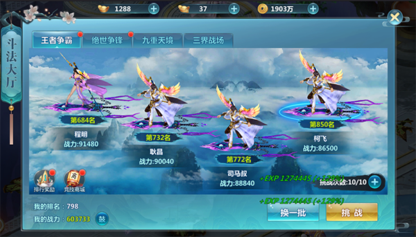 点击之后就来到【斗法大厅】的【王者争霸】界面了,可以点击选择一名玩家进行PK。如果觉得他们战力都太高了,不太可能打赢。可以尝试右下角的【换一批】。
