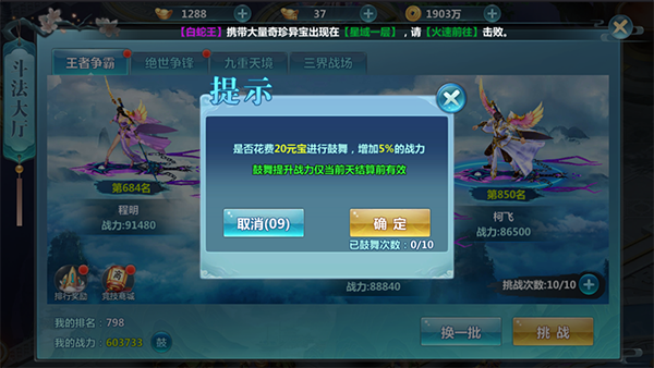 在左下角自己战力右侧还有【鼓】,点开之后可以花费元宝提升战力,这个对冲击名次可是大有帮助。