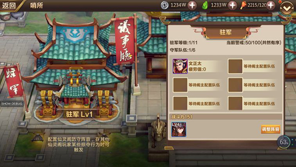 驻军等级决定可配置的阵容数量,仙灵阁内玩家防守阵容疲劳值恢复值。
