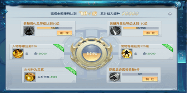 等级达到150级即可开启飞升系统,点击右上角飞升图标即可进入到飞升系统界面,完成相应的飞升历练任务,突破自身极限,即可渡劫飞升!