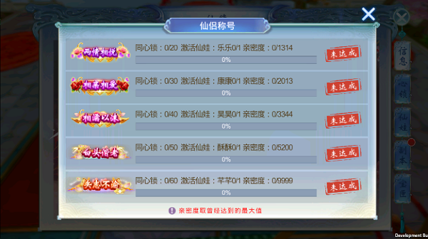 结婚后即可逐步获得仙侣专属称号,每个称号的获取条件不同,需要仙侣双方一起培养心锁、孕育仙娃、提高亲密度等。只要相爱的两个人一起携手,就能从“两情相悦”一路走到“白头偕老”,最终创造“矢志不渝”的爱情神话!