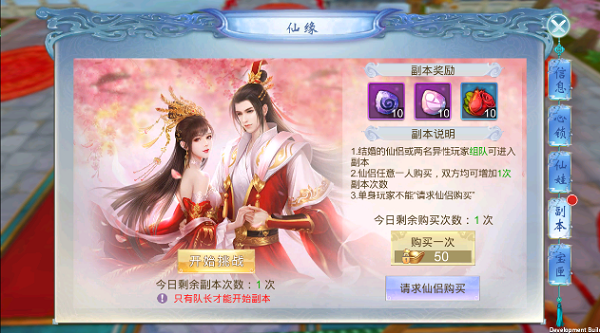 仙侣任意一人购买,双方均会增加一次副本次数。