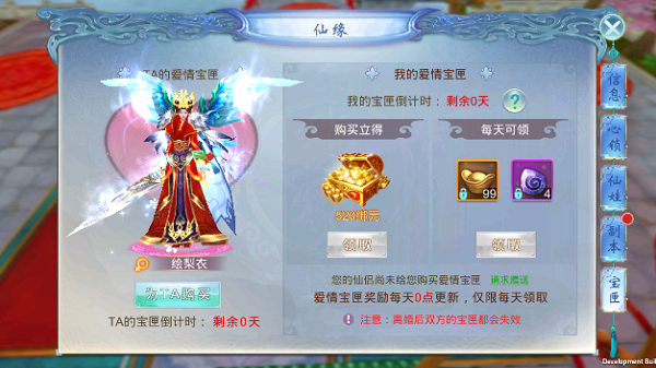 激活后即可领取1次520绑元奖励,并且持续30天每天都能领取1份日常奖励,真的非常超值划算!但如果仙侣双方离婚,则两个人的爱情宝匣都将失效,大家离婚前可要三思哟!