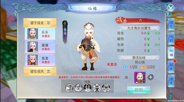 激活第一个男娃要求仙侣双方同心锁均达到20级,而激活第一女娃则需要40级。如果您等不及想要个baby的话,直接到商店购买仙娃道具就可以提前激活啦!