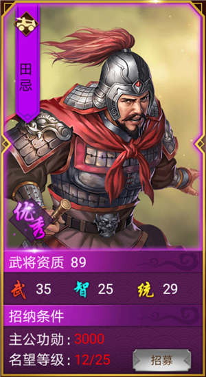 获得方法:当玩家的功勋到达3000,名望等级到达25时即可直接招募。