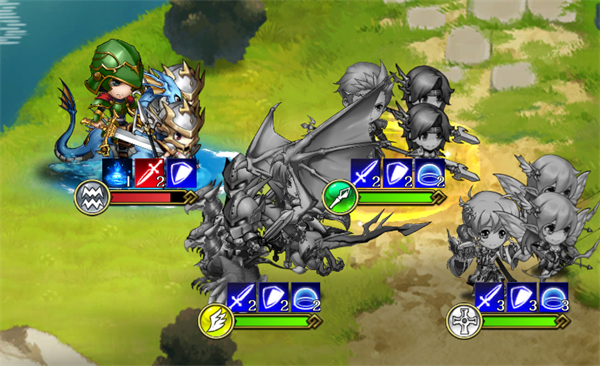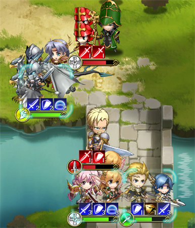 第二回合,格尼尔开启超绝,我方应不管左侧两个不满血的小兵,而一举向右秒杀右侧两个满血小兵,这里,如果兄贵练兵场并没有点出天空射手和姬武神,那就用2级精灵和重装枪兵来代替,而雪莉则利用天赋优势秒杀两个敌军,剩下一个水兵,下回合再杀。
