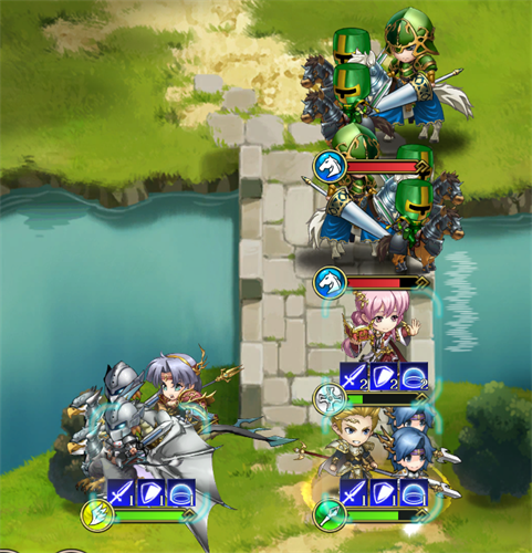 第六回合初始情况如图,对方骑兵冲艾美达被格尼尔护卫反击致死,而阿伦则由于被减攻的关系并没有通过克制关系击杀我方格尼尔。