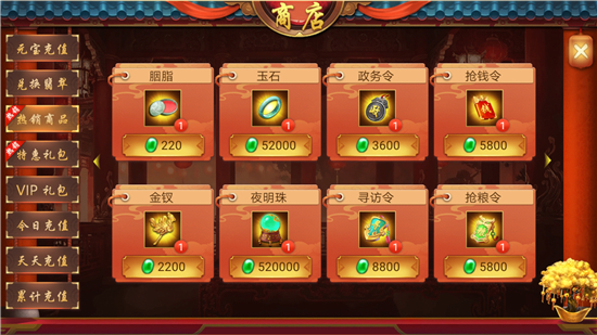 翡翠可以在商城中的热销商品中购买大量道具,比如:胭脂、玉石、政务令、抢钱令、金钗、夜明珠等等实用道具,也可在招贤楼中使用翡翠招募武将扩大玩家的整体实力。