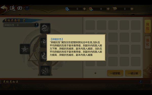 异能抗性:异能抗性是灵纹系统中一项比较特殊的属性加成,该属性只在我们接下来要介绍的副本玩法“秘窟探索”中生效,在该副本中,敌人的难度会与玩家的异能抗性成反比。