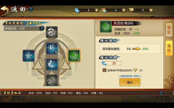 灵纹强化:在游戏中,玩家还可以通过强化来提高灵纹的基础属性加成效果,灵纹强化后的效果不会随着灵纹的更换而消失,更换灵纹后依旧会继承当前的强化效果,强化灵纹需要消耗玩家的寒溟石碎块以及七曜石碎块,随着强化等级的不断提高,强化的成功率也会发生变化,这时,使用启灵符则可大大提升玩家强化的成功率!