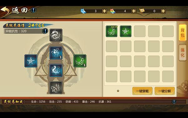 灵纹:在灵纹系统中玩家分别可以安装“龙”“凤”“虎”“鱼”“星”“月”六种灵纹,每个灵纹都有对应的等级和品质。