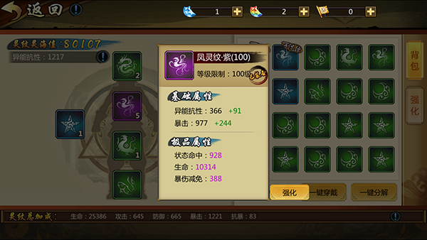 属性加成:每种不同的灵纹都会有固定的基础属性加成,其中“龙灵纹”与“虎灵纹“对应攻击加成, “鱼”与“月”对应生命加成,“凤”与“星”分别对应暴击加成和防御加成。
