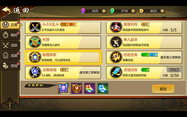 副本玩法“秘窟探险”:介绍了那么久的灵纹系统,那么你一定会好奇,“灵纹”以及相关的材料在哪里获取呢?这就要说到现在介绍的“秘窟探险“玩法了,该副本可以在”日常“中找到,其每天由5次的挑战机会。