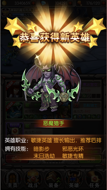 恶魔猎手是VIP礼包内的英雄,如果你人品好的话可以在魂石招募中获取到他。他属于一个强力的输出英雄,拥有四个技能分别为末日浩劫、暗影步、混乱打击、闪避。