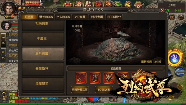 《烈焰武尊》最具存在感的BOSS(反面的)。在赤红色的月亮的照耀下,死亡伴随着恶魔的阴影,在毫无声息的袭击中突然来到。赤月恶魔长期潜伏在山谷深处,代表着玛法大陆最邪恶、最强大的势力,是一切罪恶的根源。如此高大上的设定,却成为无数勇士的心理阴影,因为它的外形只是一滩……额,自己体会吧……