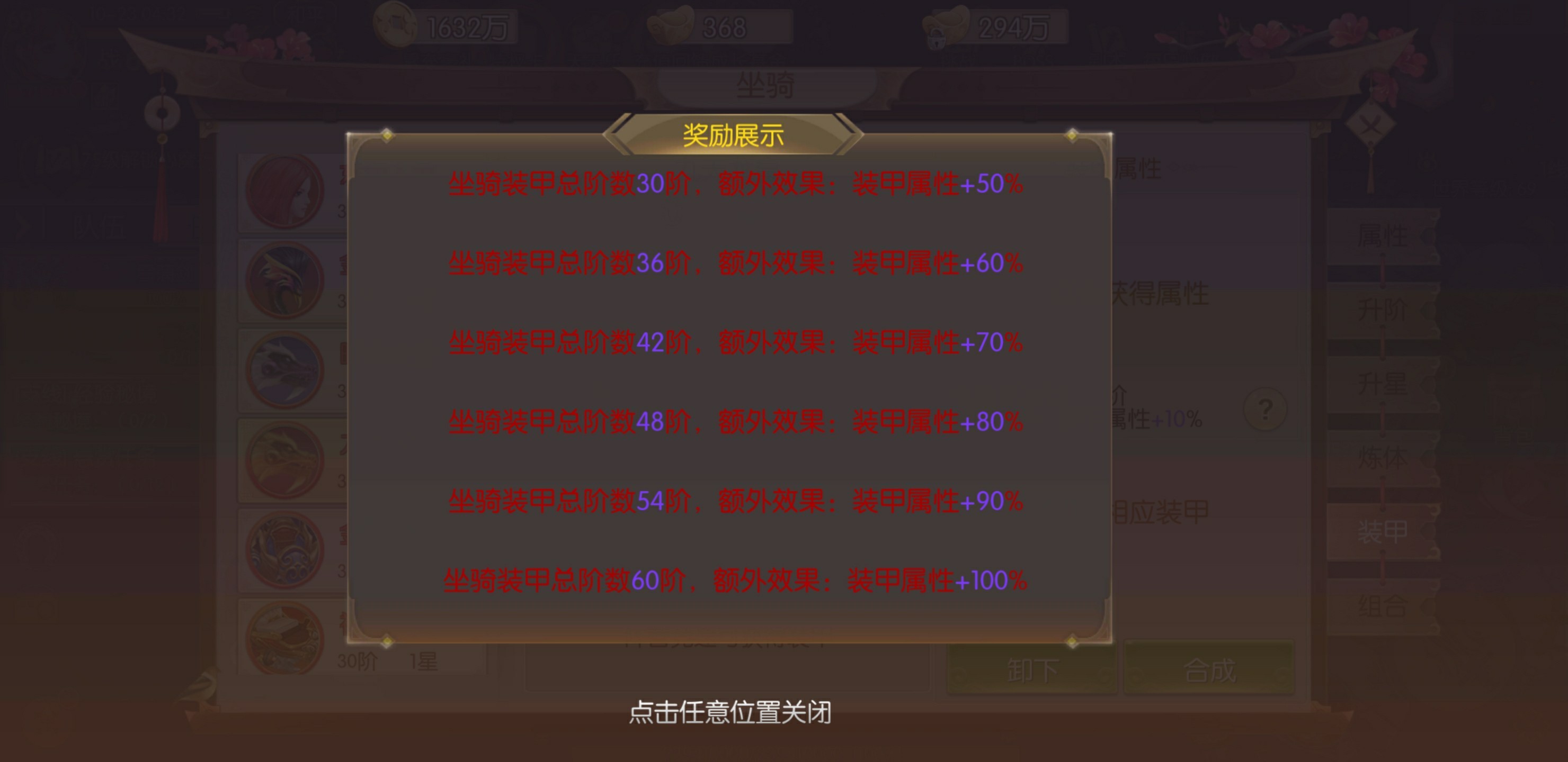 给坐骑穿上装备后,会激活一部分属性附加于少侠自身,激活属性加成会根据坐骑装甲的总阶数进行变更。坐骑装甲总阶数最低为6阶,可获得装甲属性10%加成,之后每增加6阶属性也会增加10%加成,最大可增加至60阶,激活装甲属性100%。