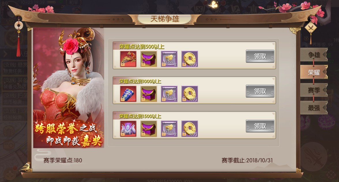 天梯争雄中奖励分为三种,分别是赛季奖励、荣耀奖励和每日任务奖励。其中赛季奖励每月1号0点结算并开始发放,根据玩家当前段位以及排名由邮件发送对应奖励,少侠只有参加战斗,才能激活奖励哦。奖励包括极品称号和大量元宝,算是收获颇丰。荣耀点奖励——当少侠战斗获得的荣耀点达到一定数值后,即可激活获得,奖励包括红色品质装备,纹章箱子,若干金币和元宝等。每日任务奖励则需少侠完成任务后才能获得,该任务每日固定时间重置,会有大量荣耀点奖励。