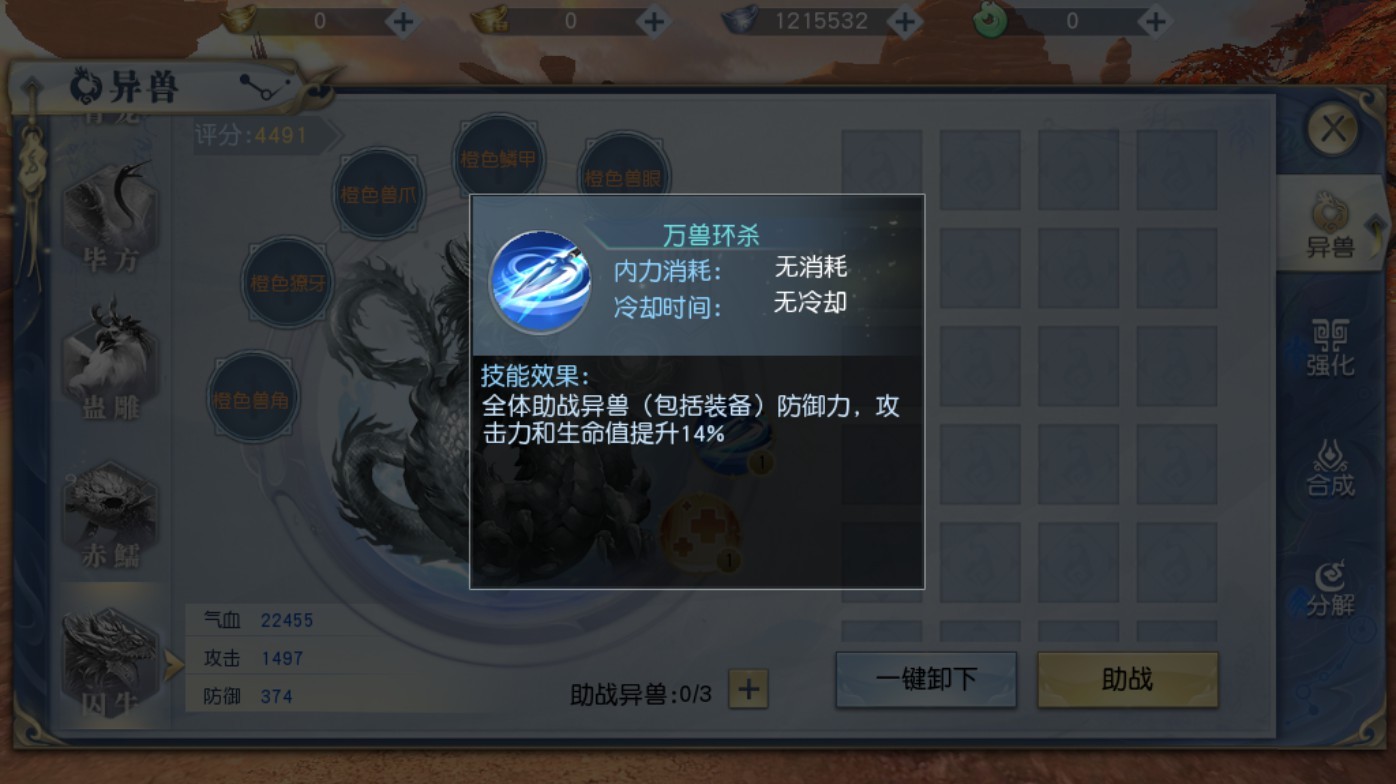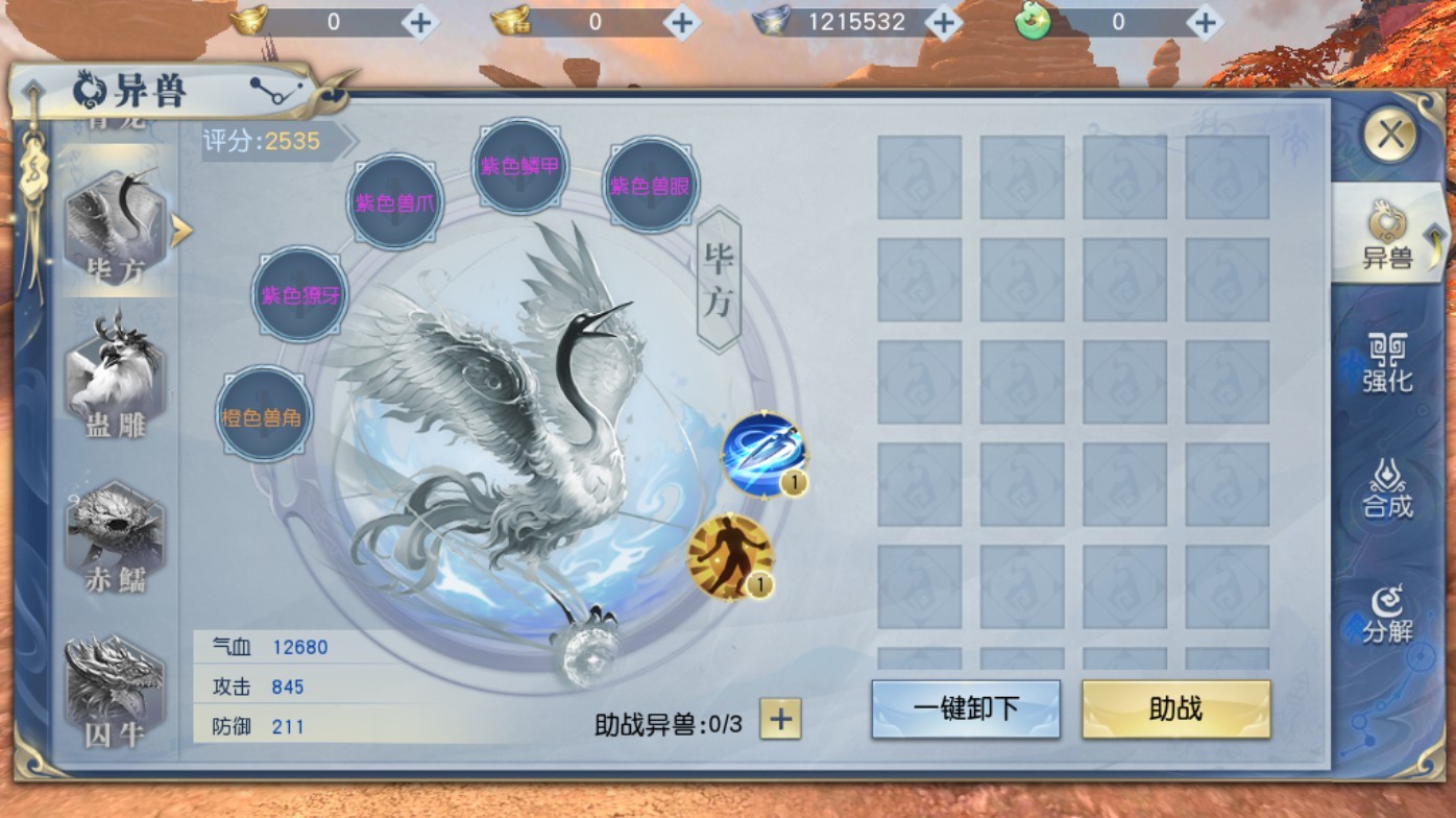 古之异兽,生于混沌,成于鸿蒙,有大威能,通天彻地,异兽择有缘者而侍,非英雄者不能降服也。新版本中,极大地丰富了异兽系统,除了之前的九尾狐和四圣兽,还添加了四种全新的异兽——神鸟毕方,猛禽蛊雕,怪鱼赤鱬和洪荒巨兽囚牛。