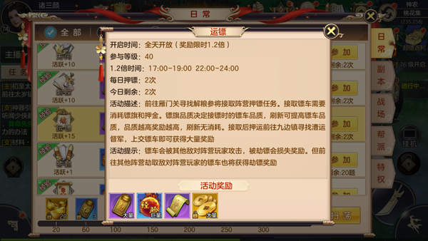 玩家达到40级可参与,该任务全天开放,每日可完成2次,国运期间(17:00-19:00 22:00-24:00)奖励1.2倍,完成运镖可获得大量经验、绑银、功勋、阵营资金和保底符奖励。