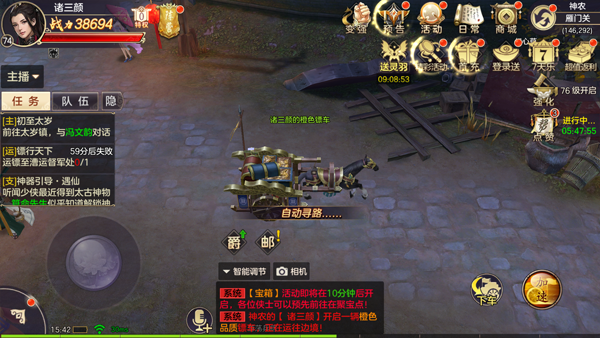 3. 运镖路途较为遥远,少侠可以点击右下角的“加速”,提升镖车跑动速度,当然,镖车有可能因为您的过度催促,造成短暂的异常哦!运镖期间可能会遭到敌方阵营攻击,受到攻击时,少侠可以点击界面右下角的“下车”,击杀敌方,保护镖车;