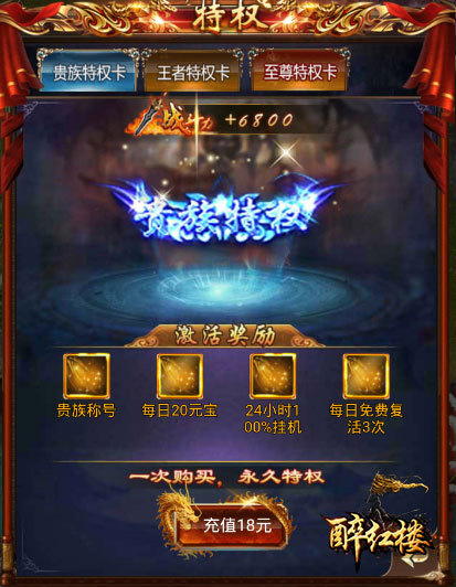 游戏设有贵族特权卡、王者特权卡和至尊特权卡,购买后可以享受其特有福利。 充值18元激活贵族特权卡,可获得贵族称号、每日20元宝、24小时100%挂机和每日免费复活3次的奖励;充值68元激活王者..