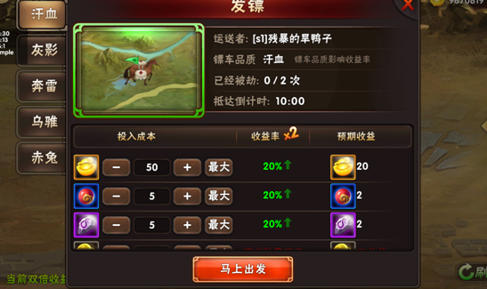 点击发镖发出镖车,每天中午12点-14点、18点-20点是双倍奖励时间~ 各位主公及时参与呦~! 选择心仪的马匹拉镖,马匹品质影响镖车的收益率哦~可以选择投入的成本,同时可以查看到镖车达到目的地的..