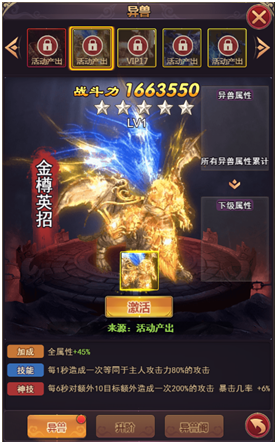 《修真界》世界中仙魔当道,自然也少不了法力高强的得道异兽,各位修士若可获得异兽将极大的提升自己的实力!同法宝一样,异兽同样分为:蓝、紫、橙、红、金5种品质,品质越高实力越强横。异兽除了可以给主人带来属性提升外,还拥有自己的技能,紫色及以上异兽还拥有神技!目前异兽的获取方式大致分为:活跃宝箱获取、VIP等级获取、游戏内活动获取以及在“异兽阁”通过兽魂来购买。