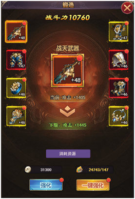在《修真界》中,“打造”是红色装备的独有培养方式,并且只有一转及以上的红装才能进行打造哦,各位修士可通过消耗金装打造石及铜钱来将红色装备提升至金色,大幅提升装备原有属性,获得更强套装加成!