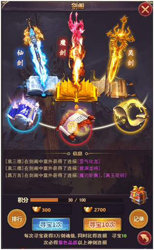 目前《修真界》中连招只能通过“功法阁”来抽取,玩家可通过消耗“连招令”或元宝来“寻宝”,寻宝可获得剑魂和随机品质的连招。寻宝十次必得一本紫色品质连招,而首次十连还会赠送一本橙色品质连招!各位修士,快来抽取更加强力的连招吧!
