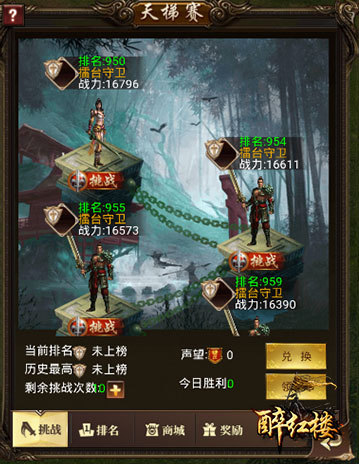 玩家在天梯赛中,每天只有十次的免费挑战机会,可以根据敌我双方的战斗力对比,来选择合适的敌人,成功打败名次高的敌人,就可以得到声望奖励以及上升名次。