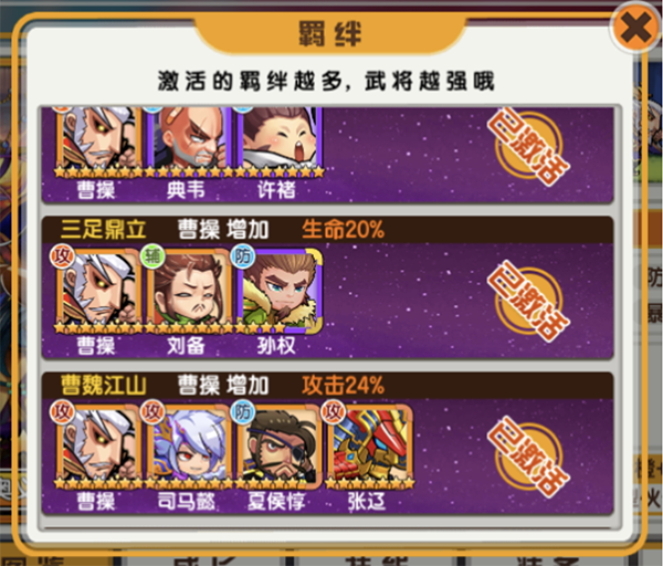 曹操有2个羁绊是非常容易解锁的,需要的是典韦、许褚、郭嘉。