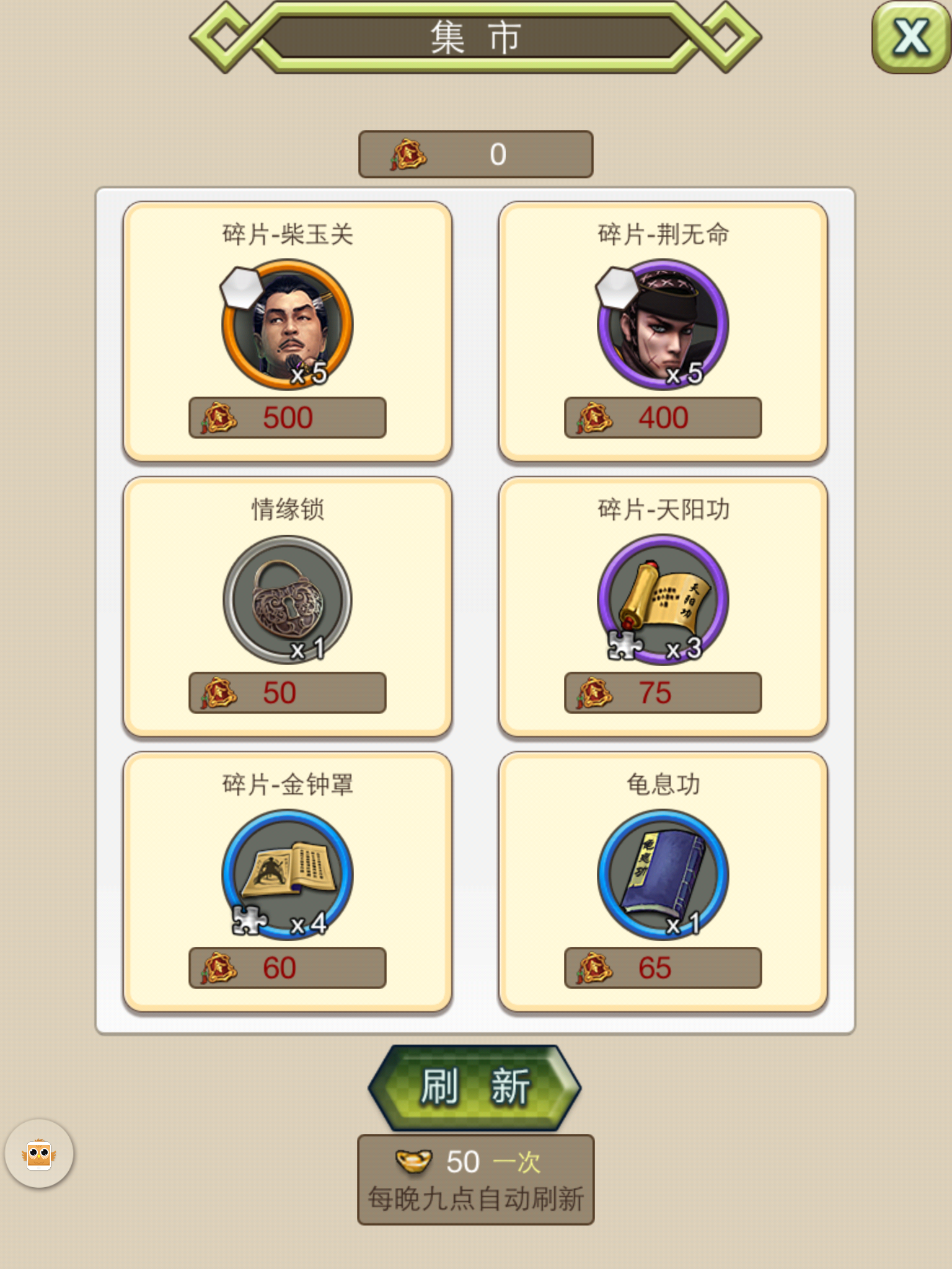 玩家在集市中可以使用比武大会排名获得的江湖令兑换各类道具,高级侠客碎片、高级武功、人参等游戏资源。集市刷新时间为每晚9点。