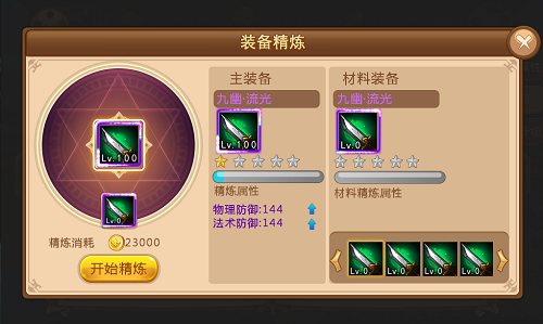 玩家消耗同种装备和金币,可提升装备的精炼等级。精炼共10级,精练后增加装备的精练属性