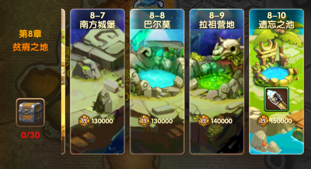 玩家点击地图上的章节,可进入该章节界面,每个章节又有数多个挑战副本,玩家通过上一关才能进入下二关。三星通关后可开启扫荡功能,消耗扫荡券可进行扫荡,快速通关收获奖励。