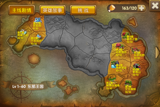 在战役系统中,同一个地图分为主线剧情、英雄故事和挑战三种玩法,玩法不同通关的条件和获得的奖励不同。
