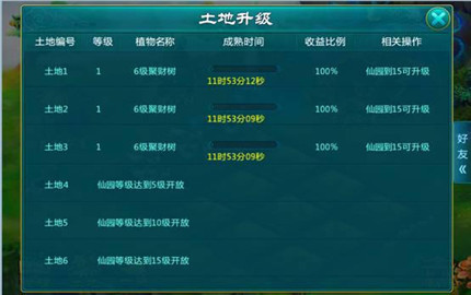 3)土地可以升级,提高收益和减少种植时间。土地需要手动升级,并且消耗一定的元宝,具体升级操作在管理界面进行。