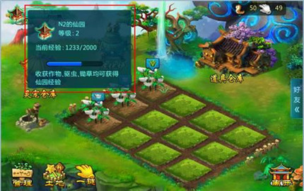 2)仙园的经验获得途径有:收获、锄草、驱虫。每个玩家每天可以进行50次锄草驱虫,每次有10点经验,另外还可以收获植物产出的银两。