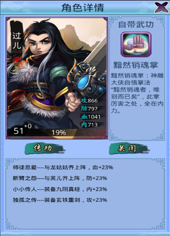 过儿属于血牛型的侠客,他通过极高的血量来抵挡对手的攻击,并有天赋武功黯然销魂掌来趁机反击,产生致命伤害。