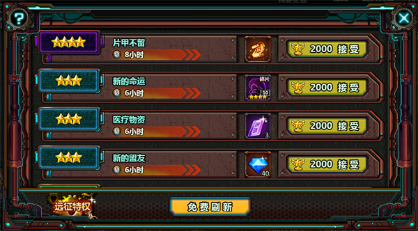 远征:身为正规军特殊作战部队的指挥官,追击叛军的任务是十分忙碌的,这个世界需要拯救的地方还有很多,派出伙伴去执行任务吧!让闲置的伙伴去帮你执行任务,也许能有不错的任务奖励,还有机会获得稀有的伙伴碎片。