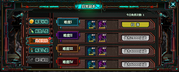 外星探险:日常副本中的外星探险副本是获得伙伴的一个重要途径,不同难度的外星探险将产出不同数量和品质的伙伴碎片,可以获取随机高星伙伴,喜欢收藏伙伴的指挥官们,每天两次的外星探险千万不能错过!