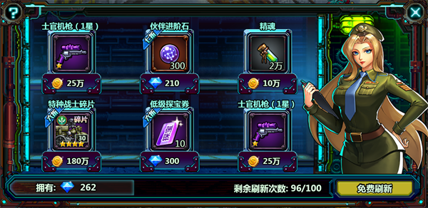 黑市商店:一名合格的指挥官,应该学会精打细算,想要用合适的价格获取资源,那么黑市商店应该多多光顾。每天可以免费刷新10次,这里经常会刷出稀有的伙伴碎片,集齐一定数量的伙伴碎片后就能合成对应的伙伴。