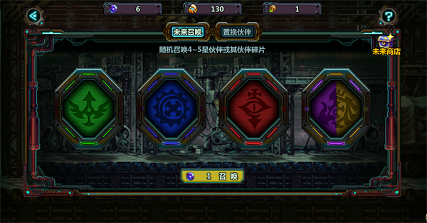 未来召唤:在未来召唤中能招募指定种族的伙伴,直接获得4,5星强力的伙伴或者是他们的碎片,参与竞技场,商城,远征等玩法就能获得未来召唤需要的材料。