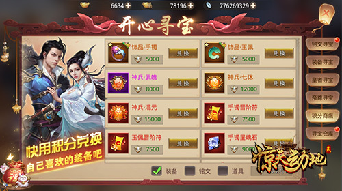 无论是极品寻宝,还是铭文寻宝,都可以获得寻宝积分。没抽到想要的物品也没关系,还可以用积分去换取。