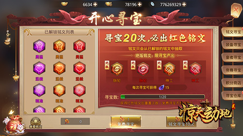 相比起极品寻宝,铭文寻宝还有个大福利,就是每隔一段时间可以免费寻宝一次铭文。当然玩家也可以通过花费元宝快速抽取大量铭文。累计寻宝次数越多,也越容易抽到极品奖励。