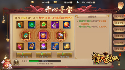 寻宝在游戏中是一个拼运气的活动,不要小看运气,运气也是实力的一部分。如果运气好的话,可以通过寻宝获得大量珍稀奖励呢!下面一起来看看这个拼运气的寻宝系统。 装备寻宝 在极品寻宝界面,可以花费元宝来进..