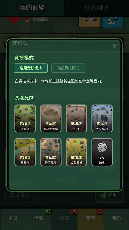 在联盟中玩家能向自己的盟友发起友谊战互相较量,在发起友谊战时,能自由选择对战地图、开启或关闭竞技模式。