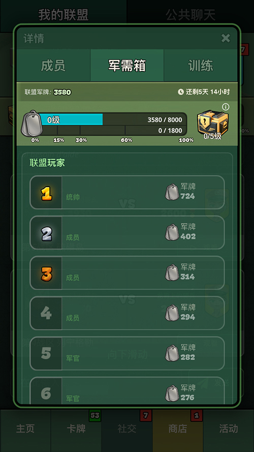加入联盟之后,每周都将有机会获得一个联盟军需箱,需要联盟中的小伙伴一起收集军牌来开启,军牌收集越多奖励也会越丰厚。对于不少前中期的小伙伴来说,每周一次的联盟军需箱会是一笔不小的资源收入。