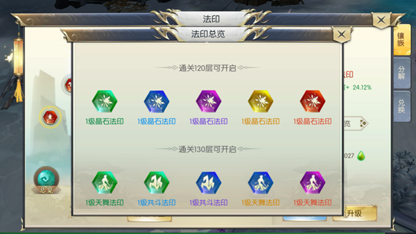 角色在达到140级时即可开启法印,法印可通过法印寻宝以及法印塔获得。通关法印塔层数可解锁后续属性更好的法印,最多可以镶嵌8个不同属性的法印。