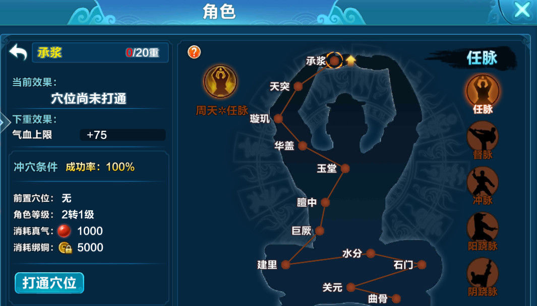 玩家到达等级时开放经脉界面,经脉需要花费铜钱和真气打通,玩家保持在线则可持续获得真气,经脉每打通一层都会得到属性的增益,当经脉全部打通到足够等级后,还可以花费经脉残页提升周天重数,极大增强少侠实力。