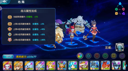 小提示:1、上阵同属性的精灵越多,获得的属性加成越多